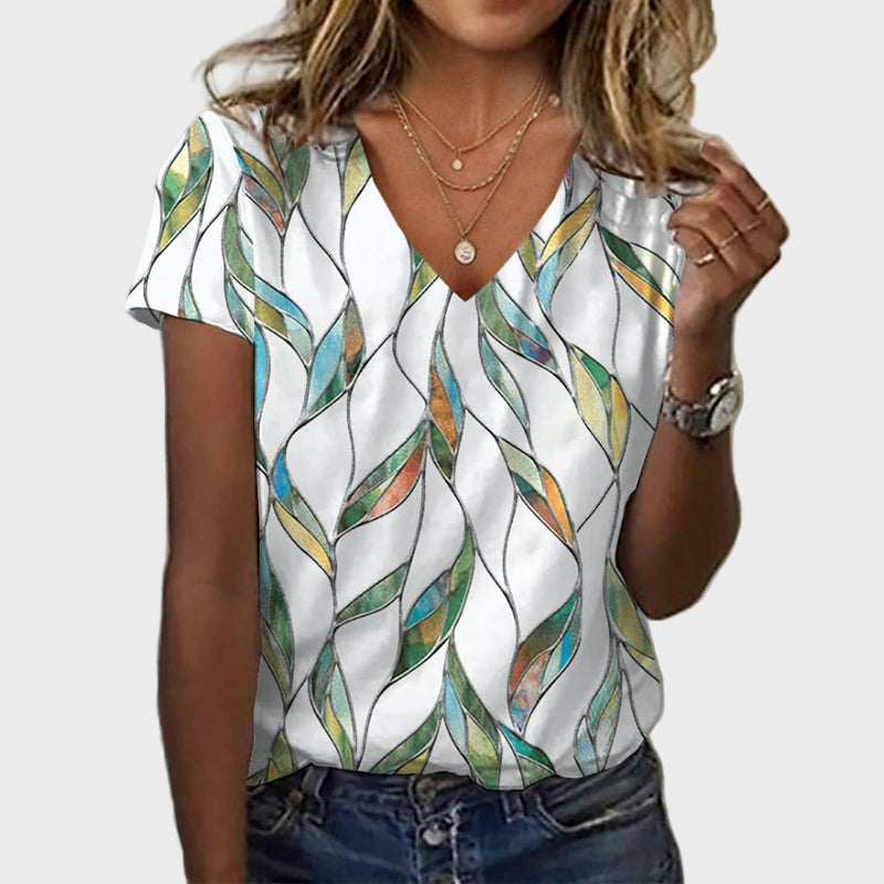 Highlight the modern side of your style with this white-based blouse, adorned with colorful wave patterns in shades of green, blue, and gold. The V-neck adds femininity, while the loose fit offers comfort and elegance for any occasion.