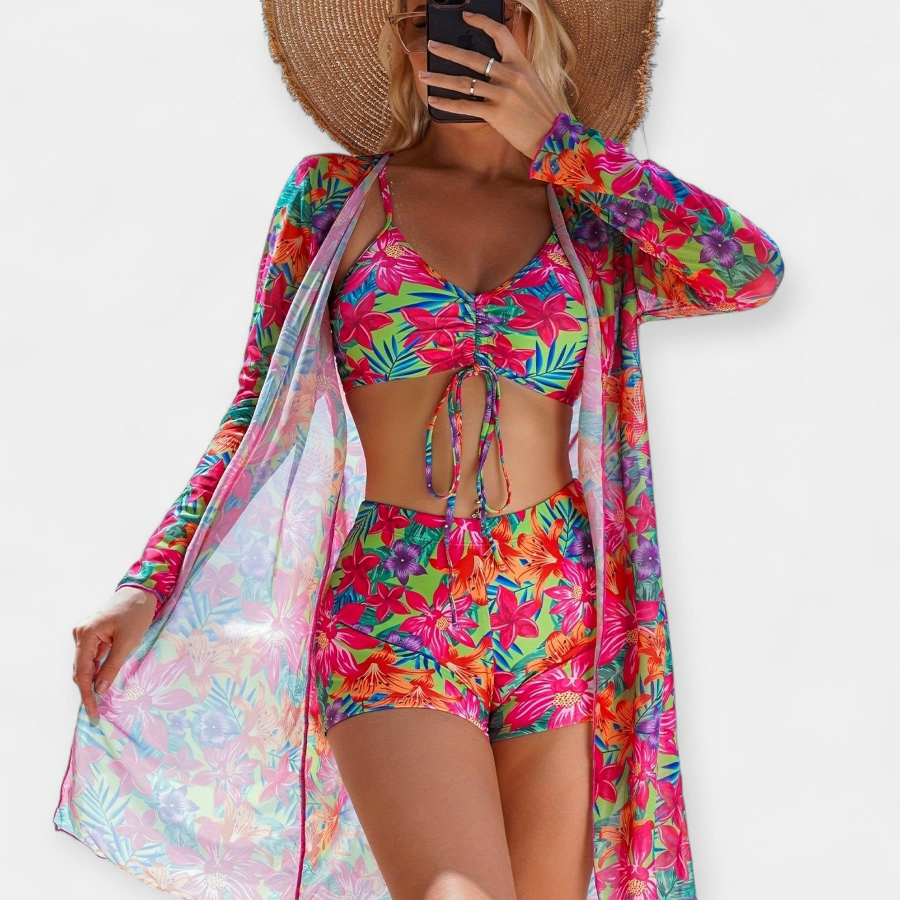 This modern set combines comfort, style, and elegance for complete summer looks. The high-waisted bikini embraces the silhouette, the bow top highlights the bust, while the lightweight cover-up adds finesse and flexibility.