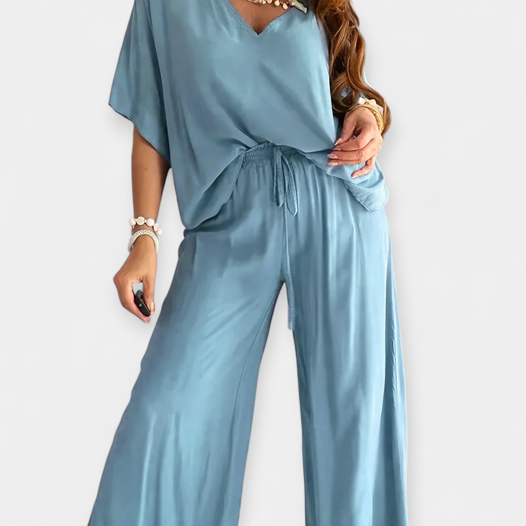 This set is the essence of relaxed elegance. The wide pants with comfortable legs harmoniously combine with a loose blouse that features a V-neckline and wide sleeves – for a style that breathes and flatters any silhouette.